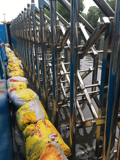 A 生產部積極組織人員,在廠區北門用沙袋進行封堵,防止因地勢低洼造成水流倒灌進入廠區: