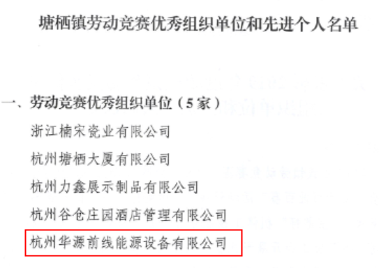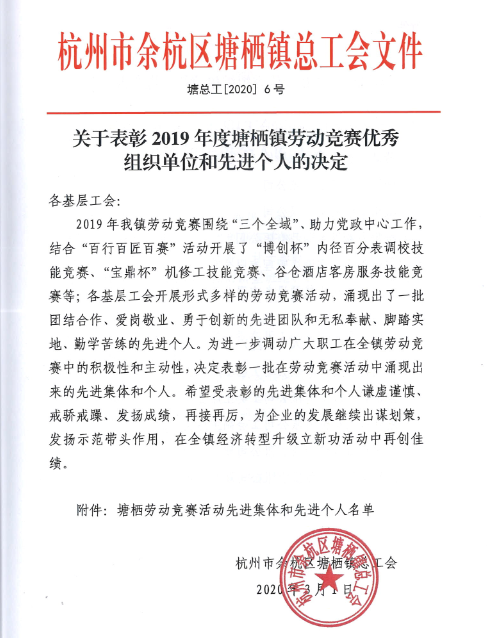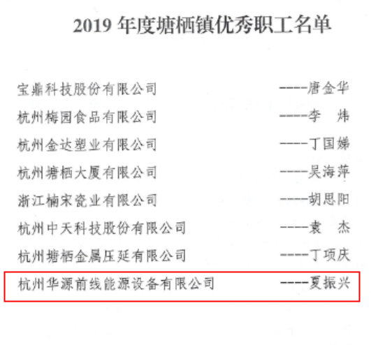 在2020年“五一”勞動節(jié)即將來臨之際,4月15日,塘棲鎮(zhèn)總工會在塘棲大廈隆重召開塘棲鎮(zhèn)2020年工會工作暨創(chuàng)業(yè)創(chuàng)新表彰大會。會上,杭州華源前線能源設(shè)備有限公司榮獲2019年度塘棲鎮(zhèn)勞動競賽優(yōu)秀組織單位,生產(chǎn)部包裝組項(xiàng)目經(jīng)理夏振新榮獲2019年度塘棲鎮(zhèn)優(yōu)秀職工稱號,生產(chǎn)部焊接五組榮獲余杭區(qū)“工人先鋒號”班組稱號。這是我公司2019年5月正式成立工會以來,繼公司2名員工獲得“塘棲工匠”和1名員工獲余杭區(qū)第七批百名職業(yè)技術(shù)帶頭人稱號后,再一次在短短不到一年時間里獲得的多項(xiàng)榮譽(yù)。