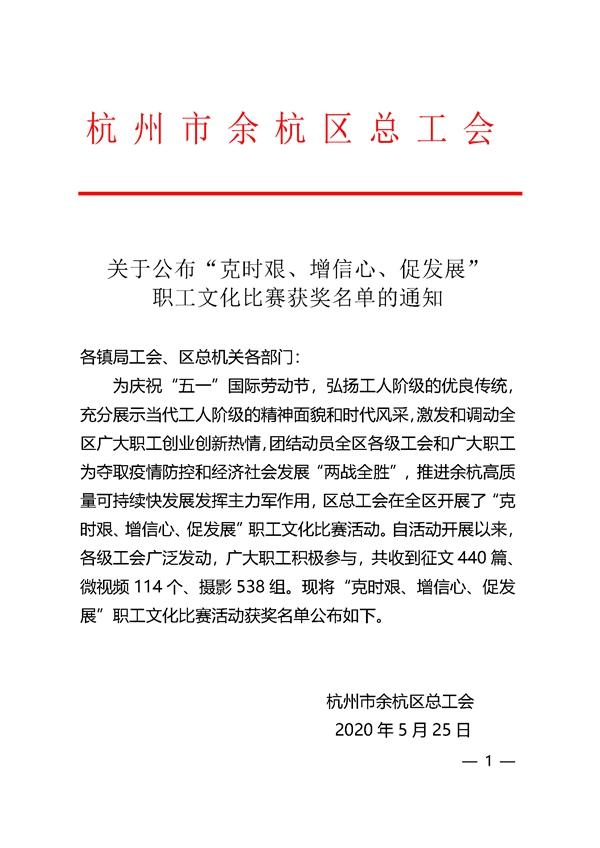 “五一”國際勞動(dòng)節(jié)期間,余杭區(qū)總工會(huì)在全區(qū)開展了“克時(shí)艱、增信心、促發(fā)展”職工文化比賽活動(dòng)。華源前線總經(jīng)理工作部副經(jīng)理陸怡代表公司投稿的攝影作品“抗擊防疫”在538組攝影作品脫穎而出,榮獲“優(yōu)勝獎(jiǎng)”。 華源前線始終以謹(jǐn)慎的態(tài)度面對(duì)疫情,以科學(xué)的措施防控疫情,以堅(jiān)定的信心保障生產(chǎn),以飽滿的熱情不懈奮斗!