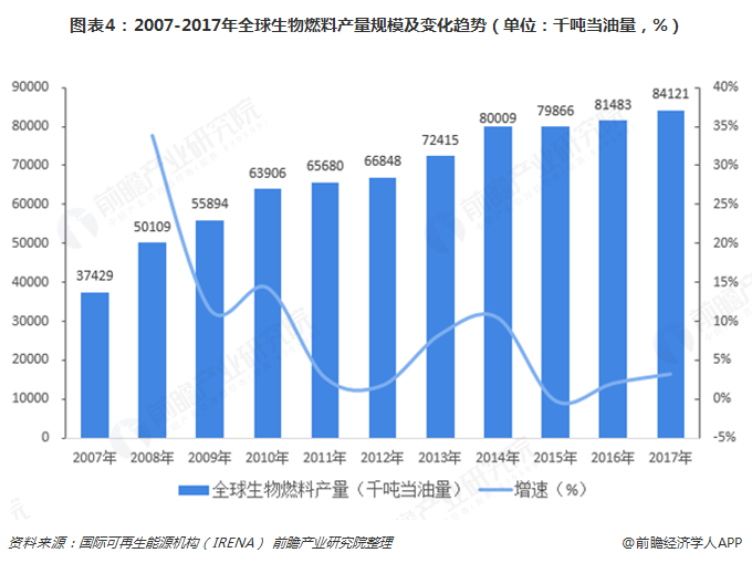 隨著全球大規模、大范圍的發展生物質能發電,生物燃料生物燃料產量規模也實現的迅速的增長。數據顯示,2007年全球生物燃料產量為3742.9萬噸當油量,至2017年上升至8412.1萬噸當油量,2008-2017年復合增長率達8.43%。